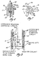 - a method of machining the walls of a cylindrical blind cavity of a workpiece, said cavity being deep and narrow with respect to the axis of said cavity comprising the steps of; (a) supporting a tubular housing for axial movement throughout substantially the axial extent of said cavity interior said tubular housing having a free end; (b) rotationally driving a spindle in said tubular housing in a manner for conjoint axial movement with the tubular housing, said spindle extending beyond said housing end for carrying a radially adjustable cutting tool; (c) inserting said tubular housing together with said rotationally driven spindle into said cavity with the cutting tool radially positioned for boring of said cavity walls, and (d) substantially immediately upon the execution of said boring, withdrawing said tubular housing from said cavity together with said rotationally driven spindle, characterised in that a tubular housing is in close-fitting tolerance to the walls of said cavity; in that said machining is stitch-machining for rough boring of said cavity; in that said cutting tool is repositioned for