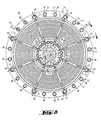 - the filtrate support plate 34 according to FIG. 8 and seen in the edge detail section according to FIGS. 9 and 10 has openings 36 distributed around the circumference on the outer edge and openings 36 ′ on the inner edge for the introduction and execution of retentate R1, corresponding openings 38, 38 ′. for the introduction and execution of retentate R2, openings 40, 40 'and connecting channels 41, 41' for the discharge of filtrate F2, the openings being completely or partially enclosed by sealing elements 42.
