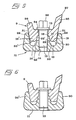 screw 15 has been initially screwed into the threadedhole 14 but not finally tightened. In this condition, the outer slopinglateral faces 21, 21' of the swinging arm are in contact with the correspondinglateral faces 20, 20' of theholder 11 only in theupper edge area 29, in that the angle of convergence between thelateral faces 21 and 21' is somewhat greater than the angle of convergence between thefaces 20 and 20'. In the condition illustrated in Fig. 5, theinner faces 22, 22' of thebeads 19, 19' furthermore are clearly removed from the innerlateral faces 23, 23' of thegrooves 16, 16'. - When the two