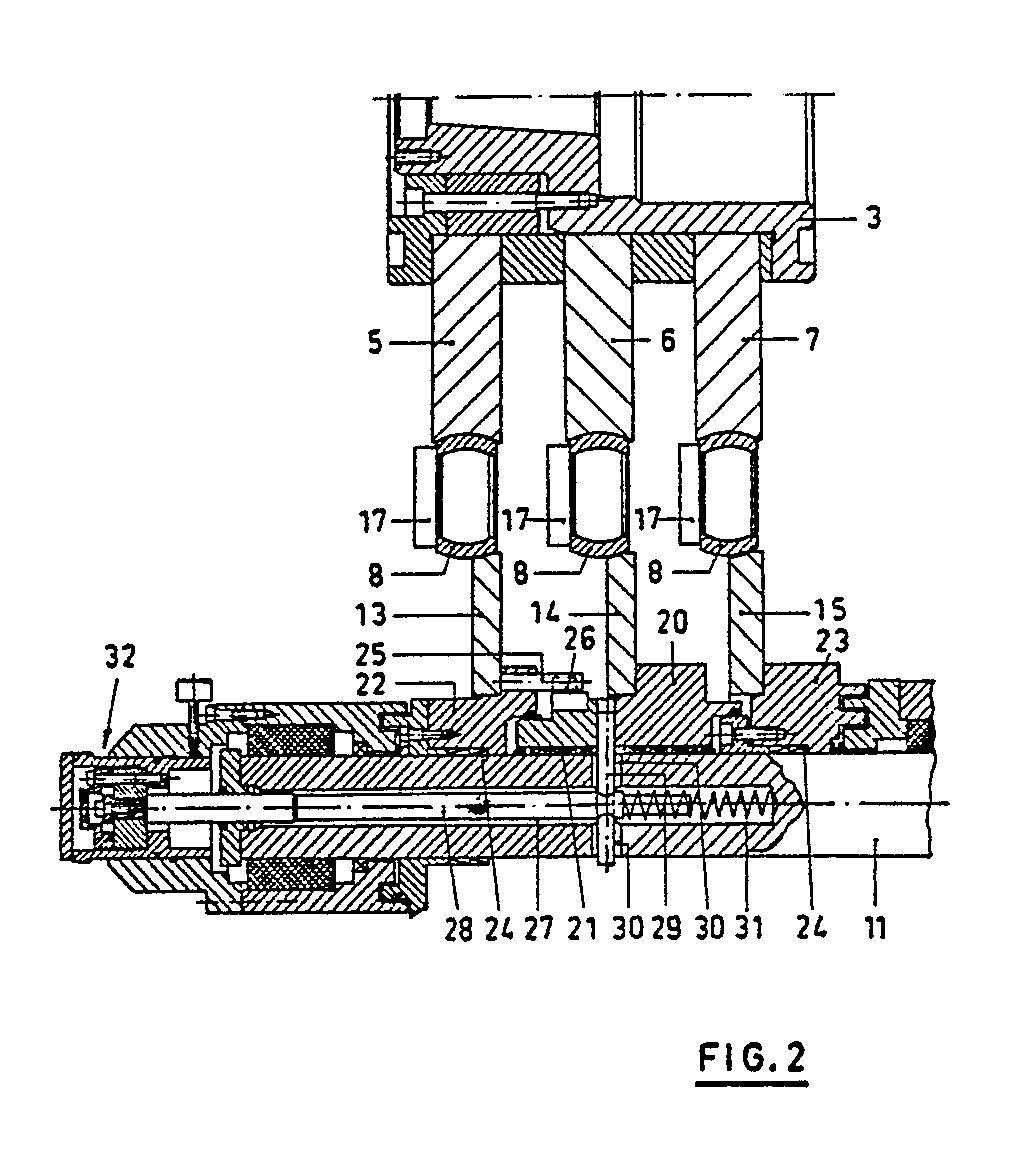 - Fig. 3 shows a section corresponding to FIG. 2 in a centerless cylindrical grinding machine for the simultaneous plunge grinding of three cylindrical workpieces.