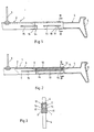 - the inventive design of the tensioner allows the use of another known type of guidance of the tensioning arms, in which the tensioning arms are located within the central part arranged at a distance from one another and on the sides facing one another are provided with a toothed rack, and that a meshing clutch pinion is mounted in the center of the middle part between the toothed bars and that a manually releasable locking device is provided for the tensioning arms.