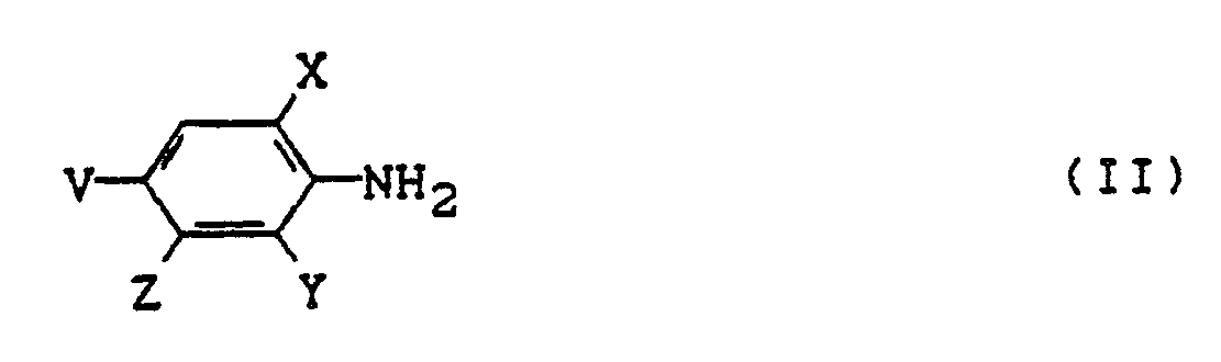 - the new azo dyes of the formula (I) are prepared in a manner known per se, for example by coupling diazotized anilines of the formula (II) on coupling components of the formula (III) wherein A, B, R1 - R5, Y, X, V, Z have the meaning given above.