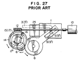 - Figures 23 and 24 show details of the construction of the clutch disc 15. More specifically, the clutch disc 15 has formed therein first engaging portions (hereinafter, referred to as elongated holes) 23, 23′ of crescent form such that they each extend over a predetermined angle and are oppositely arranged on a circle concentric with an axial hole 22, and second engaging portions (hereinafter, referred to as projections) 24, 24′ formed integrally with the worm wheel 14 such that they are opposite to each other about the centre of the wheel 14, the elongated holes 23, 23′ being respectively engaged with the projections 24, 24′.