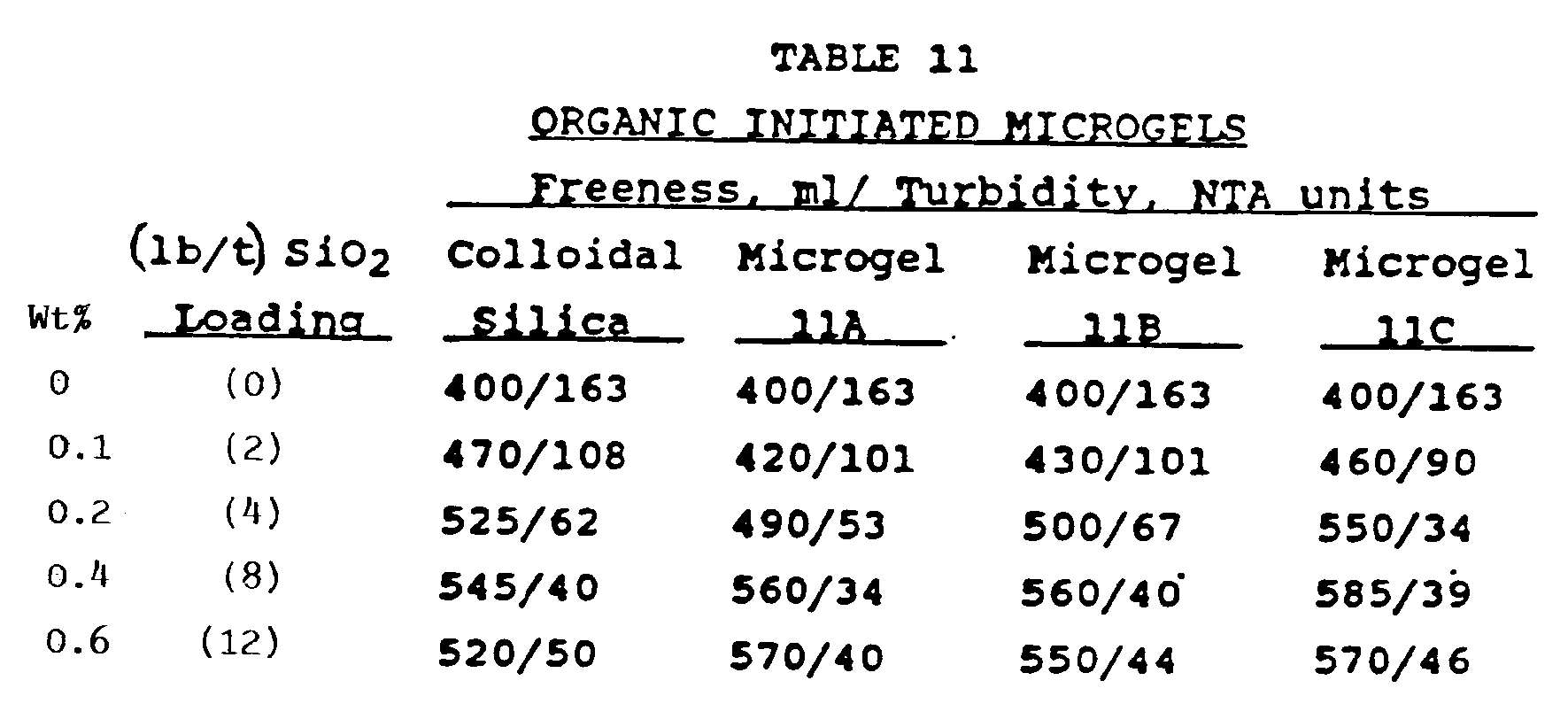 - the microgelled polysilicic acid showed an overall activity at least as good as the commercial colloidal silica and even a somewhat enhanced activity at the commercially desirable low usages of 0.05 to 0.2 wt% (1 to 4 lb/t) SiO2.