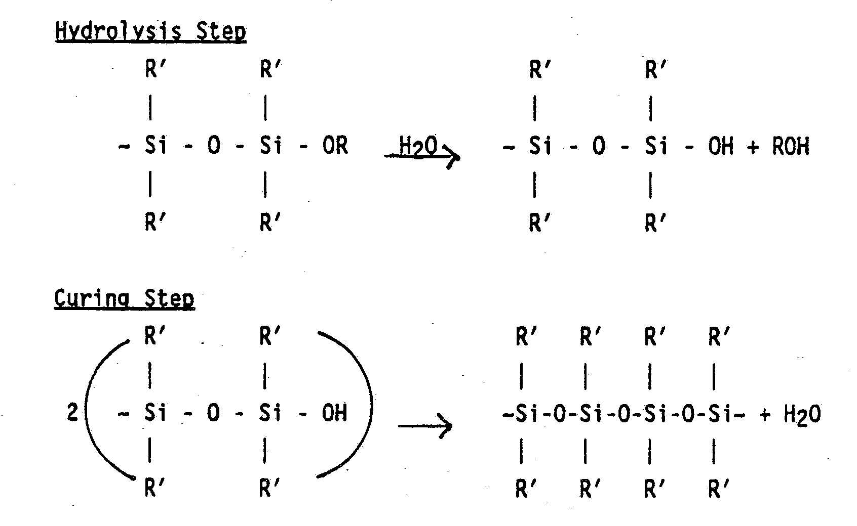 - curing often occurs when two CAFS molecules or polymers react, yielding a polymer of a higher molecular weight. [ ⁇ SiOH + ⁇ SiOH ⁇ ⁇ SiOSi ⁇ + H2O]. A more detailed version of the curing reaction is given below. This "cure” is defined herein as the formation of silicone-oxygen-silicone linkages.