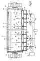 - the device 1 also includes means for adjusting the rate of flow of steam from the nozzles 50 of each compartment 40 independently of the rate of flow of steam emitted by the nozzles 50 of the other compartments; such means comprise, for example, a steam induction tube system 60 illustrated only schematically, connected to a source of saturated steam 61 under pressure and a series of steam flow rate adjustment valves 64 disposed in series along the tubes 60 one for each compartment 40; preferably, moreover, the valves 64 are controlled in an automatic manner by "feedback" from respective known sensors 65 detecting the moisture content of the web 2, only some of which are illustrated and each of which is mounted in correspondence with one of the portions 52, in such a way as to be able to detect the moisture of the corresponding longitudinal portion of the web 2 passing past this portion 52 or rather, more precisely, through each compartment 40; the sensors 65 are connected in a known way to a central control unit 70 by which, in a known way, the valves 64 are controlled.