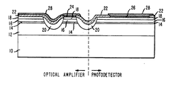 - the confinement of the current to the active region in the optical amplifier section is provided by dielectric 22 deposited on the contact layer 18 and by the semi-insulating layer 20 located in the channels.