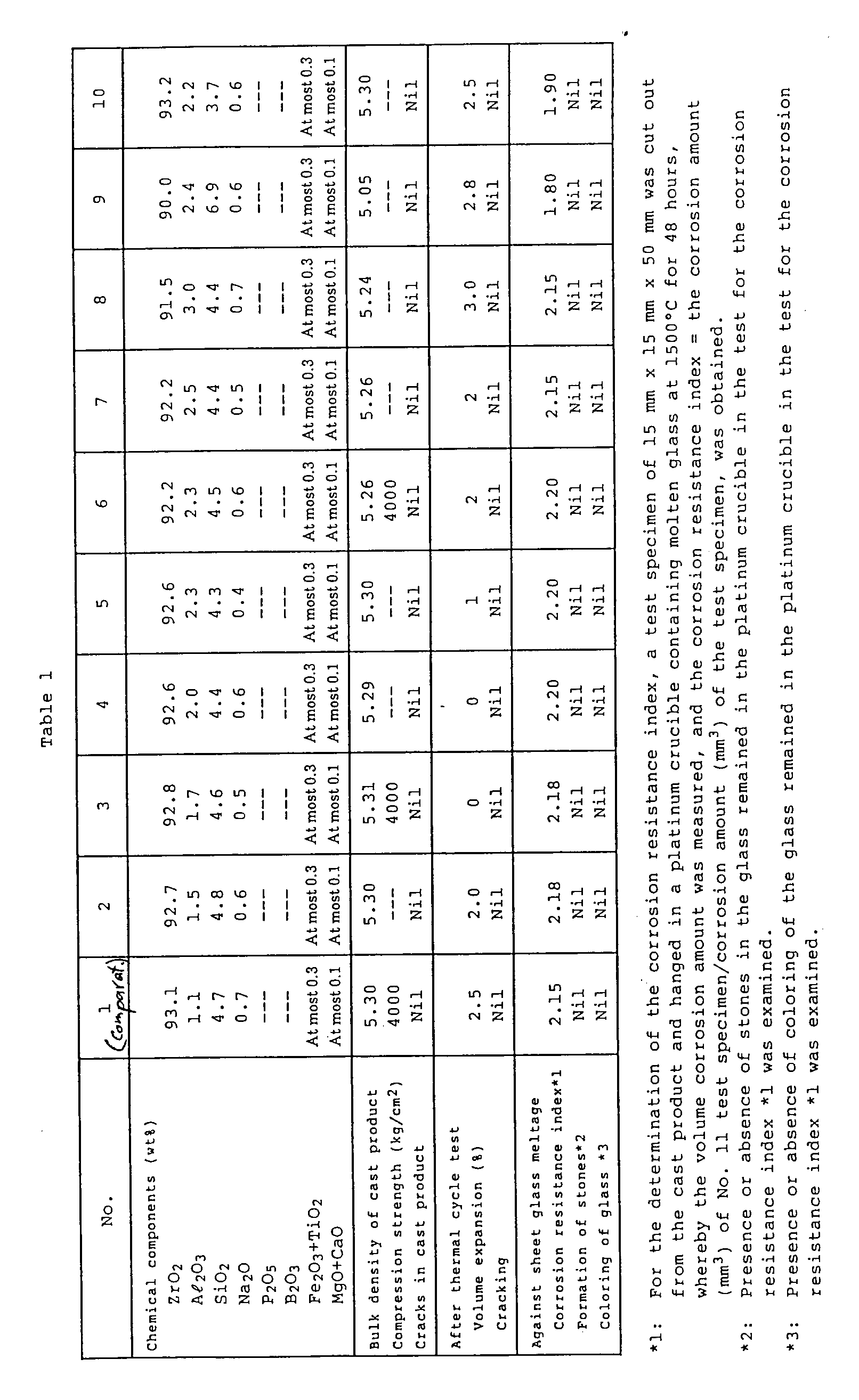 - the high zirconia fused cast refractory of the present invention is excellent in the corrosion resistance and has no substantial tendency for partial falling off during the temperature rise and substantially superior thermal cycle resistance. Accordingly, when used for a furnace for melting glass, the durability and reliability of the furnace can be improved, and at the same time cracks formed in the refractory can be minimized. Accordingly, it is possible to avoid the possibility that fine particles of refractory are freed into the glass meltage from the cracked portions of the refractory.
