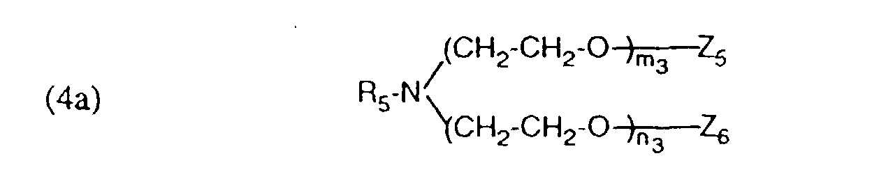 - the compounds of component (a) according to formula (1a) are prepared by 2 to 15 moles of ethylene oxide to aliphatic amines, which is an aliphatic radical having 12 to 24 carbon atoms have accumulated and optionally the adduct in the acidic monoester and optionally the acidic monoester converted into the alkali or ammonium salts or the adduct one of the quaternizing agents mentioned above.