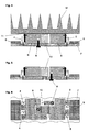 - Bei der Verwendung von zwei Kühlschienen kann die Wärmeabfuhr dadurch verbessert werden, daß die beiden Kühlschienen elektrisch isoliert, jedoch wärmeleitend mit einem weiteren Kühlkörper verbunden sind, der mit den beiden parallel und im Abstand zueinander auf der Leiterplatte befestigten Kühlschienen in Verbindung steht. Dabei kann zudem vorgesehen sein, daß die Leiterplatte nur eine Kupferlage aufweist und daß die elektrisch leitenden Befestigungsmittel die Kühlschienen mit der Leiterplatte verbinden und daß zwischen den beiden Kühlschienen die Stützkondensatoren angeordnet sind.