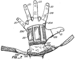 - An auxiliary band is connected to the first band and extends at an angle therefrom, away from the user's fingers, toward and encircling the user's wrist.