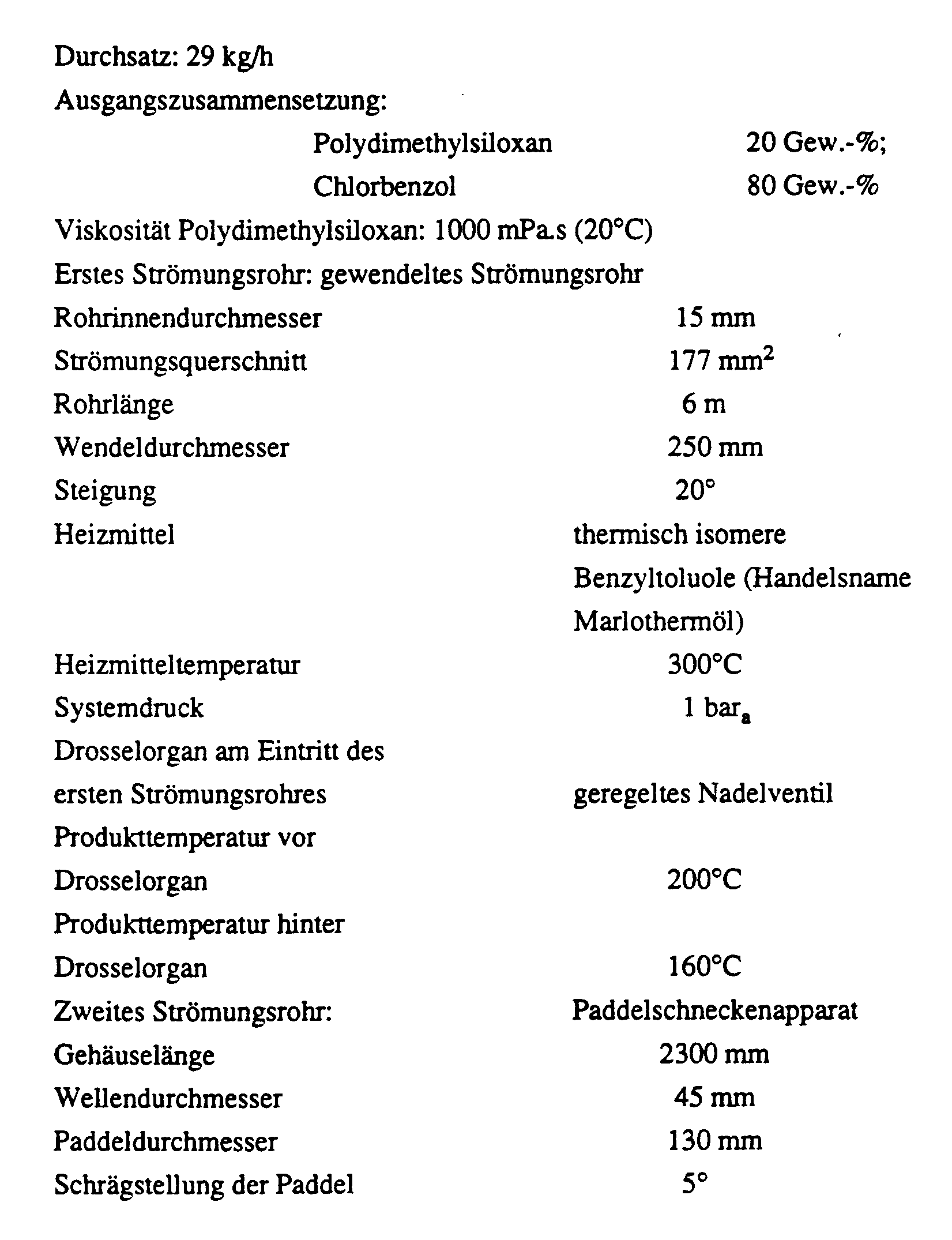 - a rotary tube is used as the second flow tube instead of the paddle screw device: Case length 1000 mm Rotary tube diameter 200 mm Diameter of the scraper knife 50 mm Inclination of the rotary tube 10 ° number of revolutions 30 rpm Flow cross-section 13,000 mm2 Heating medium Marlotherm oil Heating medium temperature 300 ° C Residual solvent content 500 ppm