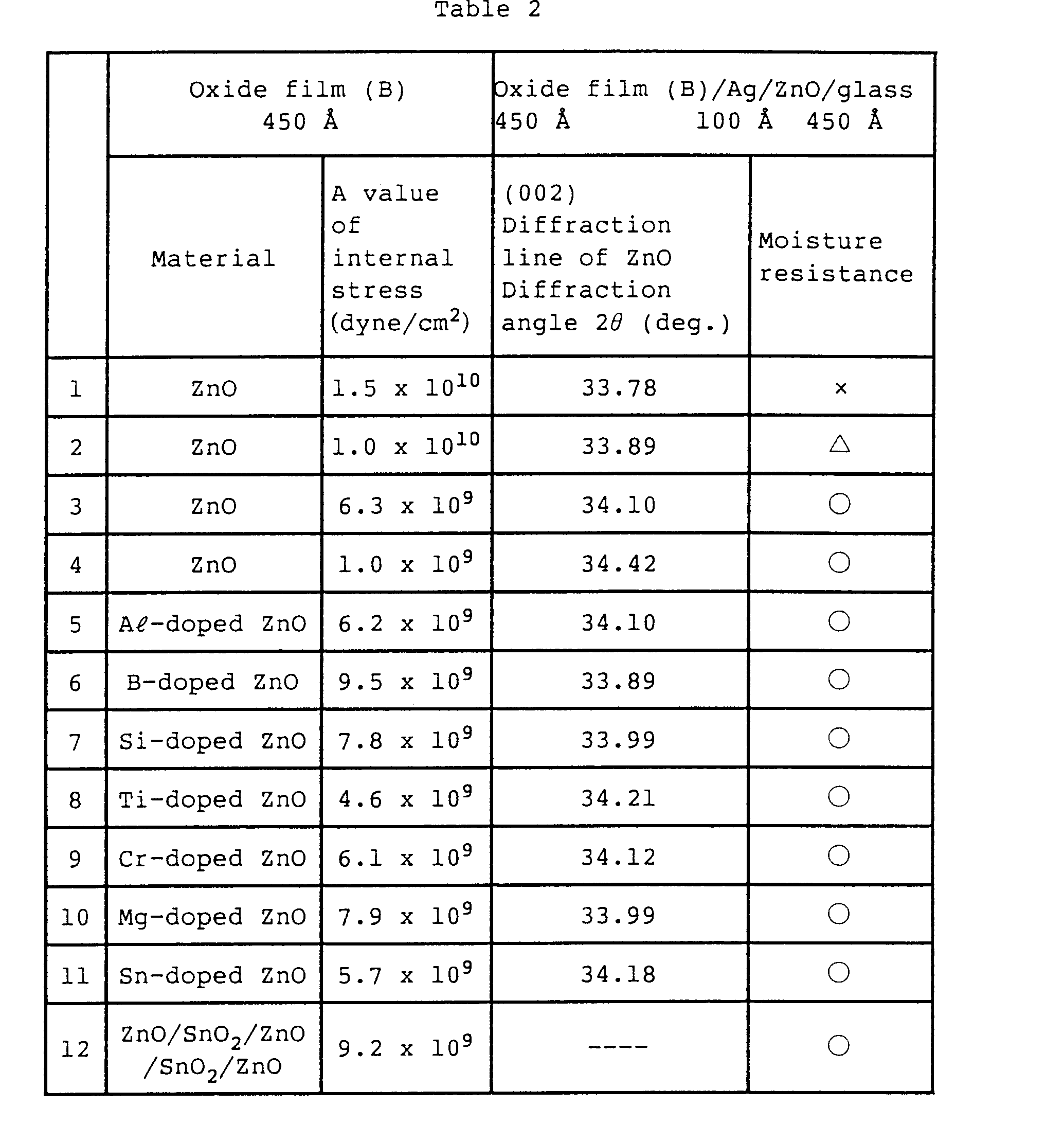 - Table 2 shows the relationship among the internal stress of the oxide film (B), the diffraction angle 26 - (center of gravity position) of (002) diffraction line of zinc oxide of a Low-E film in which the oxide film (B) is formed on Ag/ZnO/glass by a sputtering method, and the moisture resistance of the Low-E film.