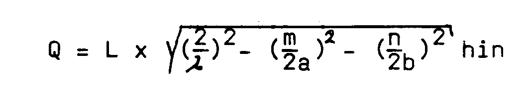 für zwei benachbarte Transversalmoden (Grundmode und 1.höherer Mode) unabhängig von L und A zumindest angenähert eine ganze Zahl ergibt und die Neigung der Spiegel so justiert ist, daß der erste höhere Mode durch den Grundmode unterdrückt wird. Dabei bedeuten: Q = Modenzahl der Longitudinalmoden, L = Resonatorlänge, = = Laserwellenlänge, 2a, 2b = Kanten des Querschnittes eines rechteckförmigen Wellenleiters, m, n = Modenzahl der Transversalmoden; Grundmode: m = 1, n = 1.