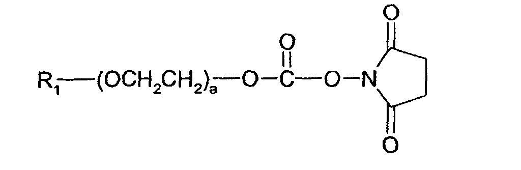• the present invention also provides a process for preparing the compound which comprises reacting a compound having the structure wherein R 1 is H, CH 3 or a carbonyloxy-N-dicarboximide group; R 2 , R 3 , and R 4 are independently selected from the group consisting of -CH 2 CH 2 -, -CH 2 CH(CH 3 )- and -CH 2 CH 2 CH 2 CH 2 -; X is a halogen; a is an integer between 1 and 1,000; each of b and c is an integer between 0 and 1,000; and the sum of a, b, and c is between 10 and 1,000; with an N-hydroxydicarboximide in the presence of a base.