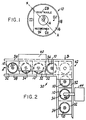 - the disc conveyor comprises a pair of spaced rails 36 and 38 having a right angle bend at one point along their lengths so that the direction of movement of the carriers is changed by 90 degrees. More specifically, the conveyor comprises a first push rod (not shown) or the like for advancing the carriers in steps in the direction of the arrow A in FIG. 1. A second pusher (not shown) or the like moves the carriers in the direction of the arrow B. Since the conveyor per se forms no part of my invention, it will not be described in further detail.
