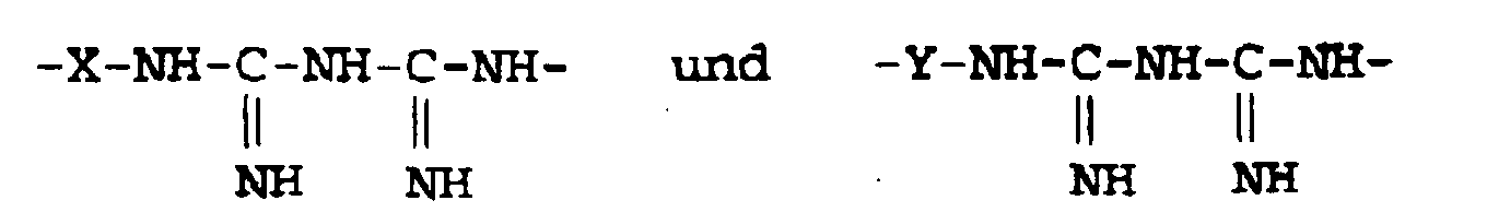 - Polymeric biguanides may be prepared by the reaction of a bisdicyandiamide having the formula: with a diamine H 2 N-Y-NH 2 , wherein X and Y have the meanings defined previously herein; or by reaction between a diamine salt of dicyanimide having the formula with a diamine H 2 N-Y-NH 2 wherein X and Y have the meanings defined previously herein.