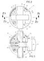 - These connecting elements 40 to 43 are initially located in the four sectors, which are separated from the circular structure of the housing half 14 by the longitudinal channel shells 15 lying at right angles to one another on the one hand and the halves of the guideway 31 and the chamber 36 on the other hand.