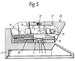 - a carriage 20 Pivotally mounted on the fixed main shaft 12 between the spring-loaded arms 13 is a carriage 20 in which a lever 21 is pivotally mounted about a fixed spindle 22 which is normal to the main shaft.