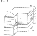 - Figure 21 shows a typical conventional AlGaAs/GaAs DFB semiconductor laser device having a mesa ridge and portions of a light absorbing current block layer disposed on both sides of the mesa ridge as a transverse mode controlling structure.