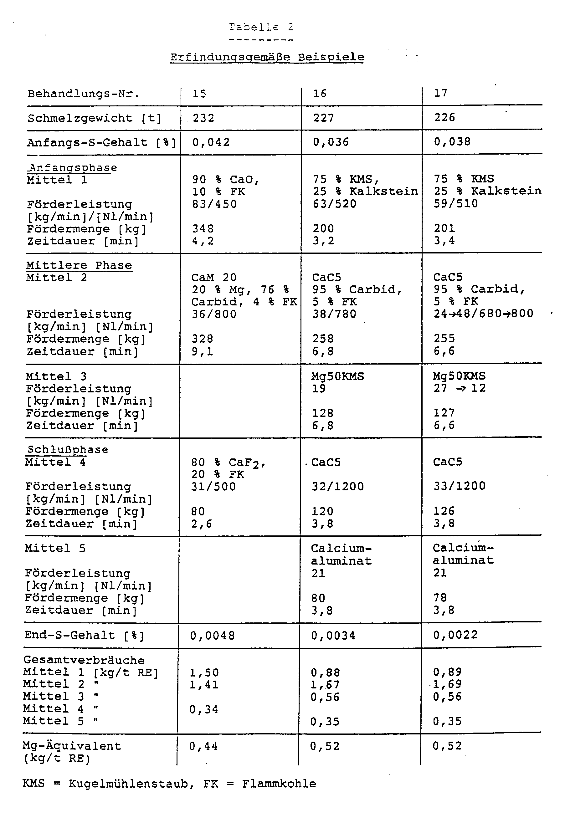 - in der mittleren Phase (II) der Behandlung als Entschwefelungsstoffe magnesiumhaltige Feststoffe und/oder Calciumverbindungen gegebenfalls mit gasabspaltenden Feststoffen und Flußmitteln