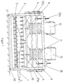 - the lower nozzles 5 are fed by a radial fan 8, which is located laterally next to the lower nozzle ribs 5 or the roller conveyor 3 outside the frame 26.