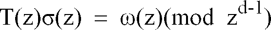 - coefficients ⁇ 0, ⁇ 1,.., ⁇ n-1 of the error evaluator polynomial ⁇ (z) are obtained by the following relation of In a case of performing an erasure plus error correction, since the error number m and the error locator X i (h+1 ⁇ i ⁇ n) are unknown it is necessary to derive those values in advance. For this purpose, it is necessary to derive the error locator polynomial ⁇ (z) dedicated to the error and a polynomial T(z) with respect to z meeting the following expression, and The error number m is obtained as the largest integer allowing the following m-degree regular matrix G h, m to be non-singular.