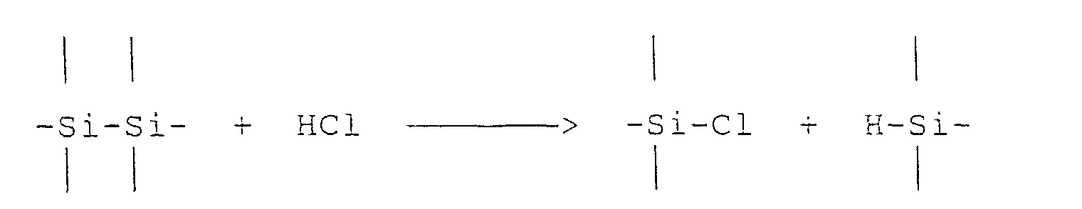 - Cleavable with hydrogen chloride to monosilanes according to the equation are only methylchlorodisilanes which have at least two chlorine atoms on one silicon atom, ie not the symmetrical tetramethyldichlorodisilane or pentamethylchlorodisilane.