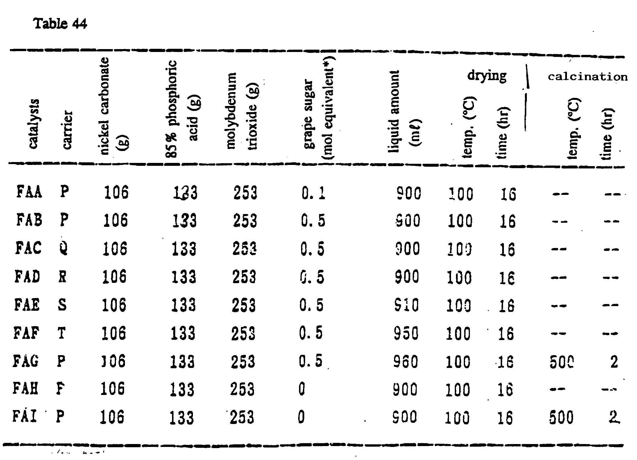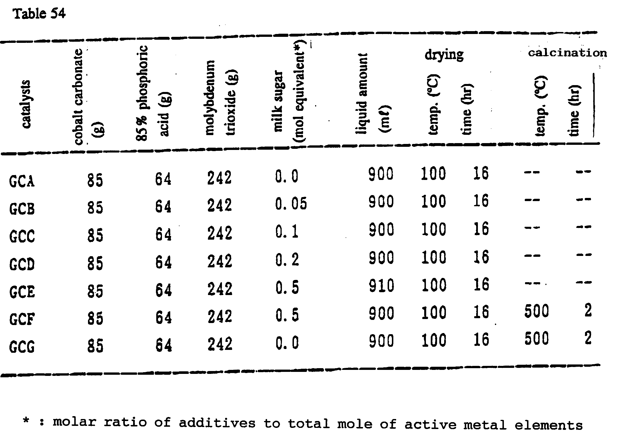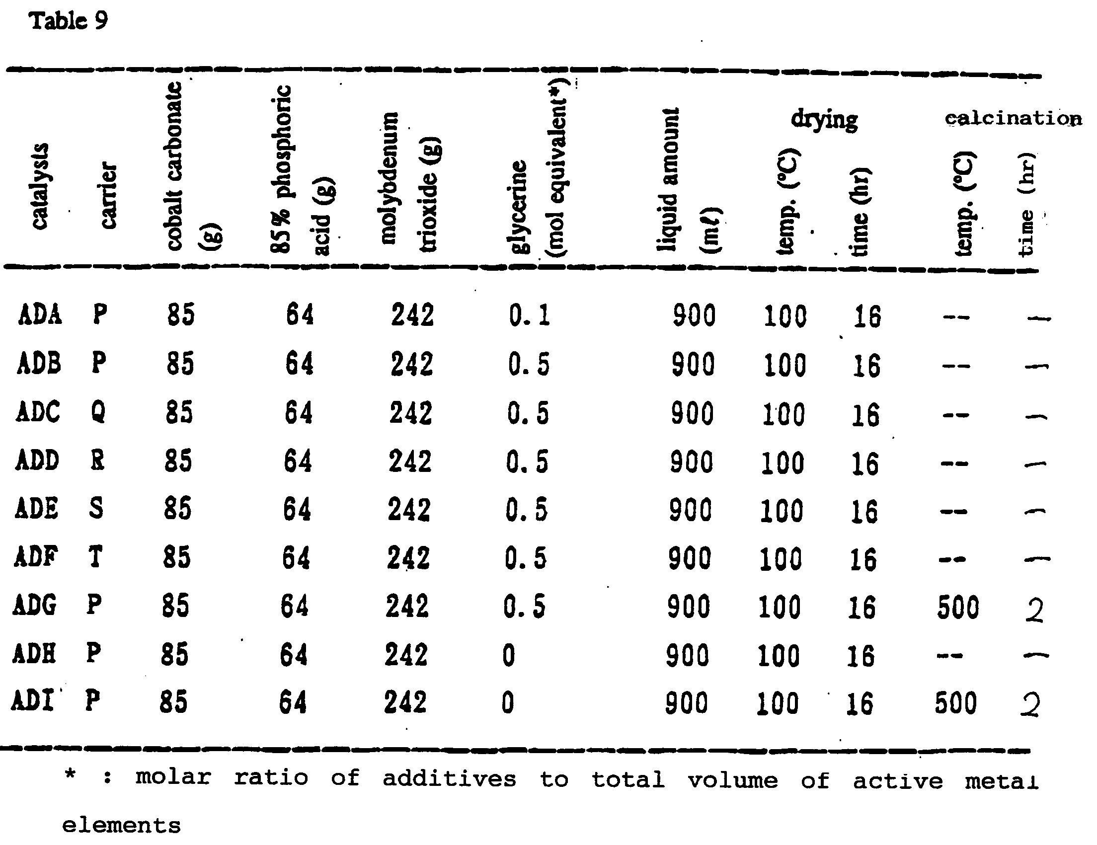 - Said catalysts according to the present invention have furthermore the characteristic that the alumina carrier substance is impregnated with a solution which is a mixture of active metal element, phosphoric acid, and a certain type of said additive, and is dried by virtue of a temperature below 200°C.