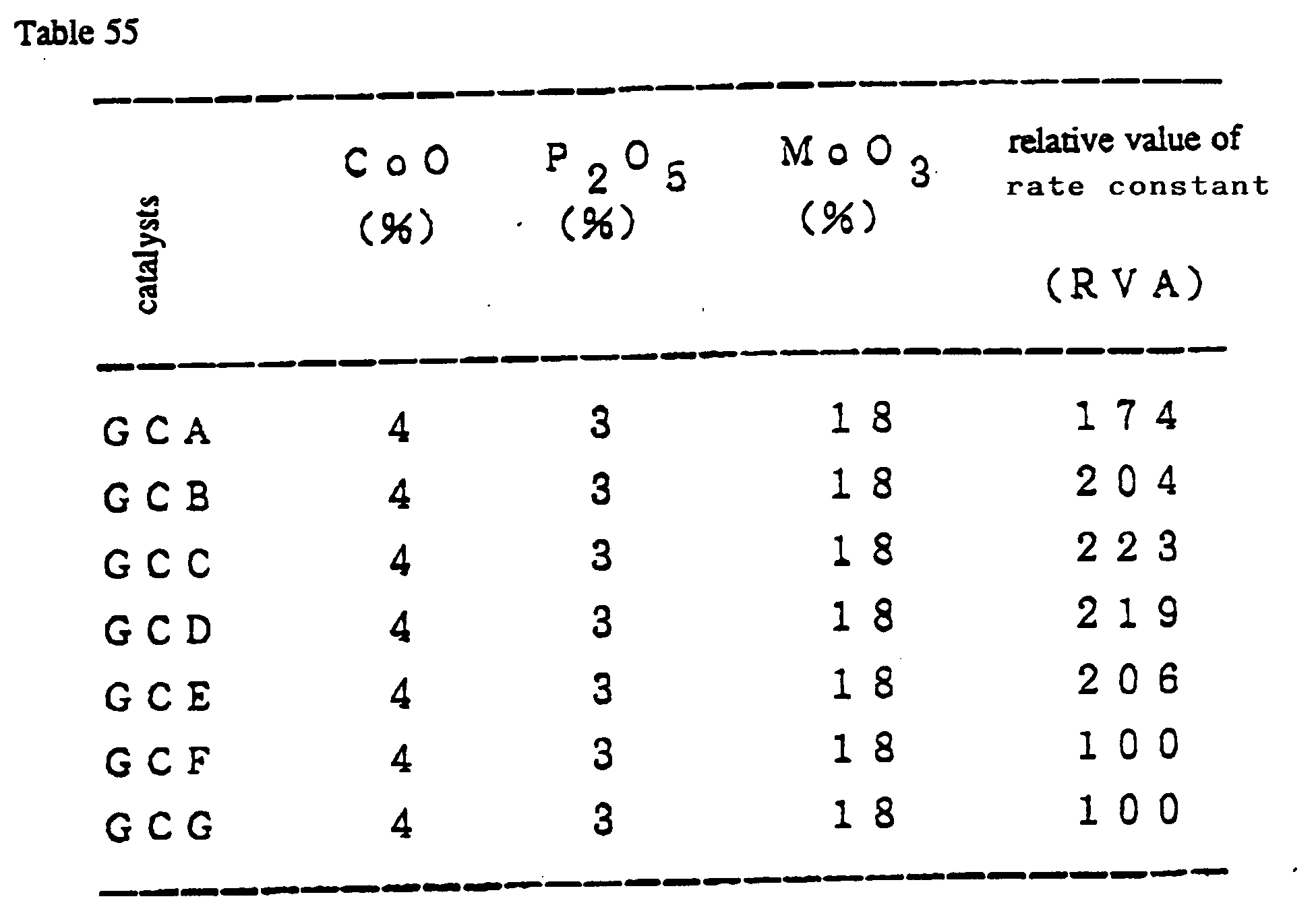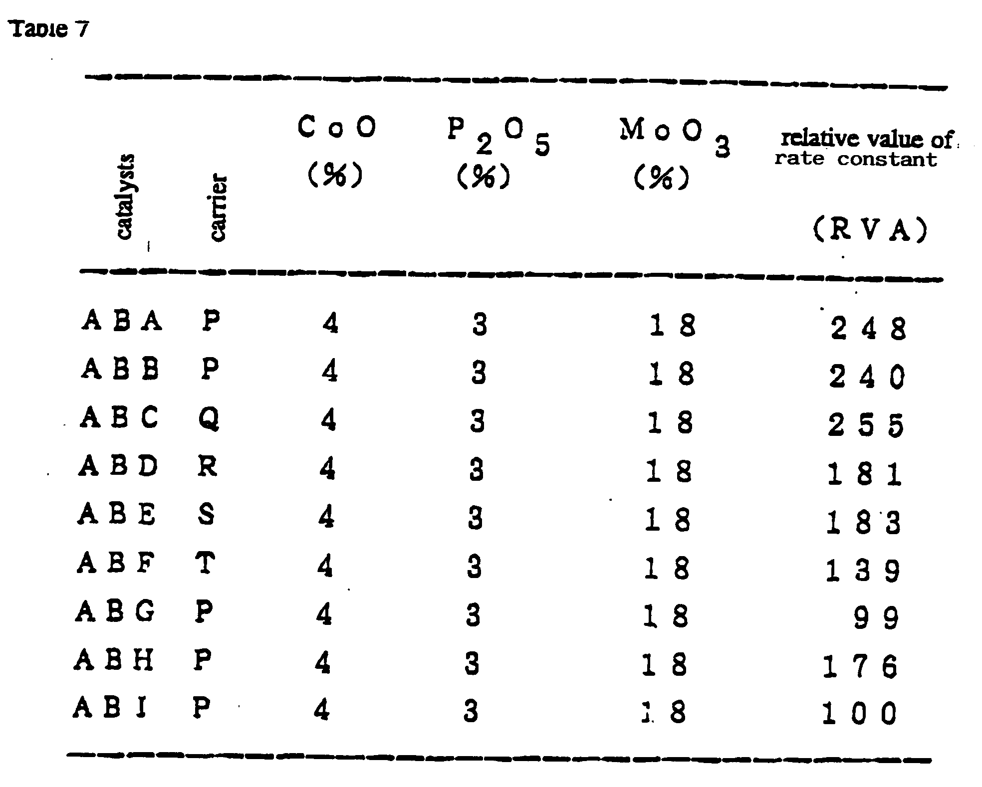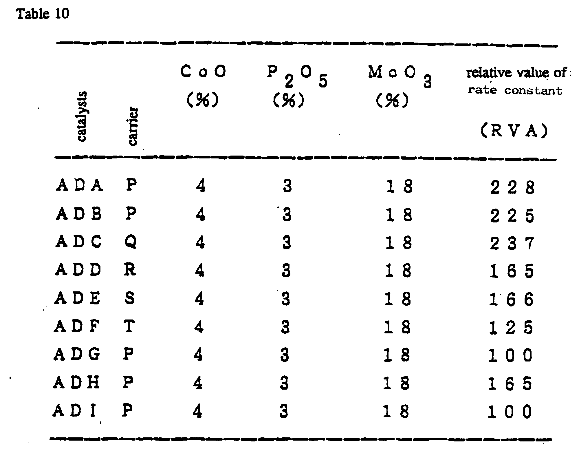 - the amount of selected active metal element to the alumina carrier substance will be preferably 10 ⁇ 30 weight % with respect to the weight of catalyst, when the catalyst weight is converted to oxide weight for the Group VI metals; and it will be preferably 1 ⁇ 8 equivalent weight % with respect to catalysts weight for the Group VIII metals.
