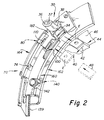 - the shuttle apparatus 100 shown in Figure 2, comprises a catcher plate 110, means 160 for supporting catcher plate 110 for movement along a path indicated by arrow 112 in Figure 1 which is preferably curvilinear, and means 140 for driving plate 110 along path 112.