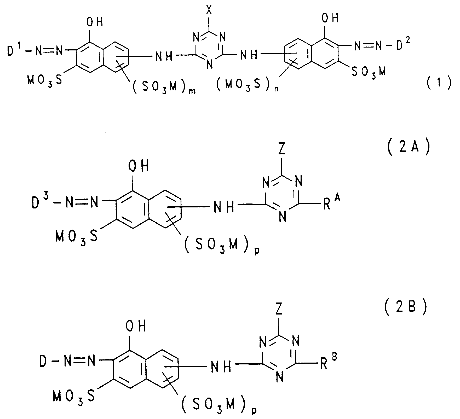 - the groups —NH — preferably connected in the 1-position to the respective 8-hydroxy-naphthalene residue, connected with the triazine residue, where m and n each represent the number 1 and these groups —SO3M each in 3- or are bound in the 4-position to the respective 8-hydroxy-naphthalene radical; in the formulas (2A), (2B) and (2C), p is preferably the number zero and the group -NH- is preferably in the 2- or 3-position, particularly preferably in the 3-position, on the 8-hydroxy-naphthalene -Rest bound.