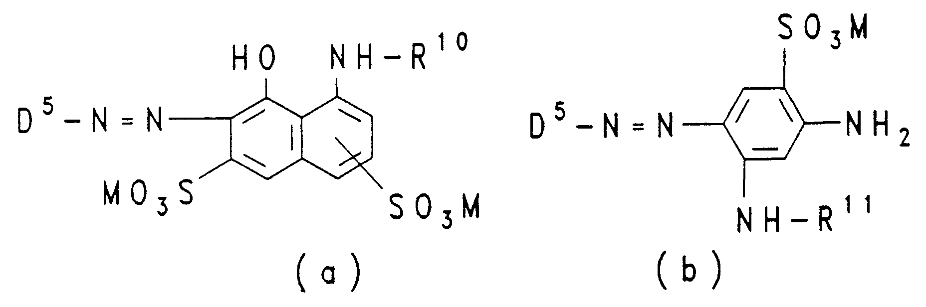 - sulfo include both their acid form and their salt form. Accordingly, sulfo groups are groups corresponding to the general formula -SO3M, carboxy groups are groups corresponding to the general formula -COOM, thiosulfato groups are groups corresponding to the general formula -S-SO3M, phosphato groups are groups corresponding to the general formula -OPO3M2 and sulfato groups are groups according to the general formula -OSO3M, in which M has the meaning given above.