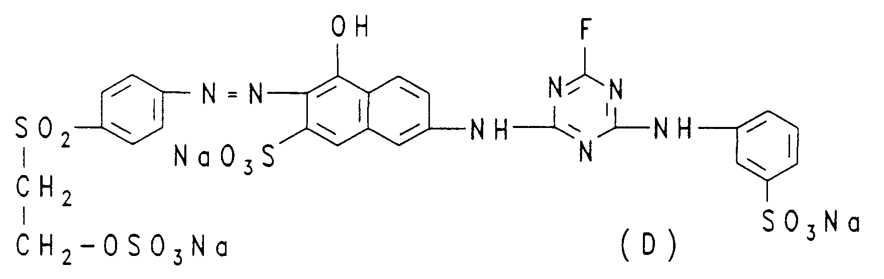 - D 3 is 2-methoxy-5- ( ⁇ -sulfatoethylsulfonyl) phenyl or 2,5-dimethoxy-4- ( ⁇ -sulfatoethylsulfonyl) phenyl or the vinylsulfonyl derivative of such a group