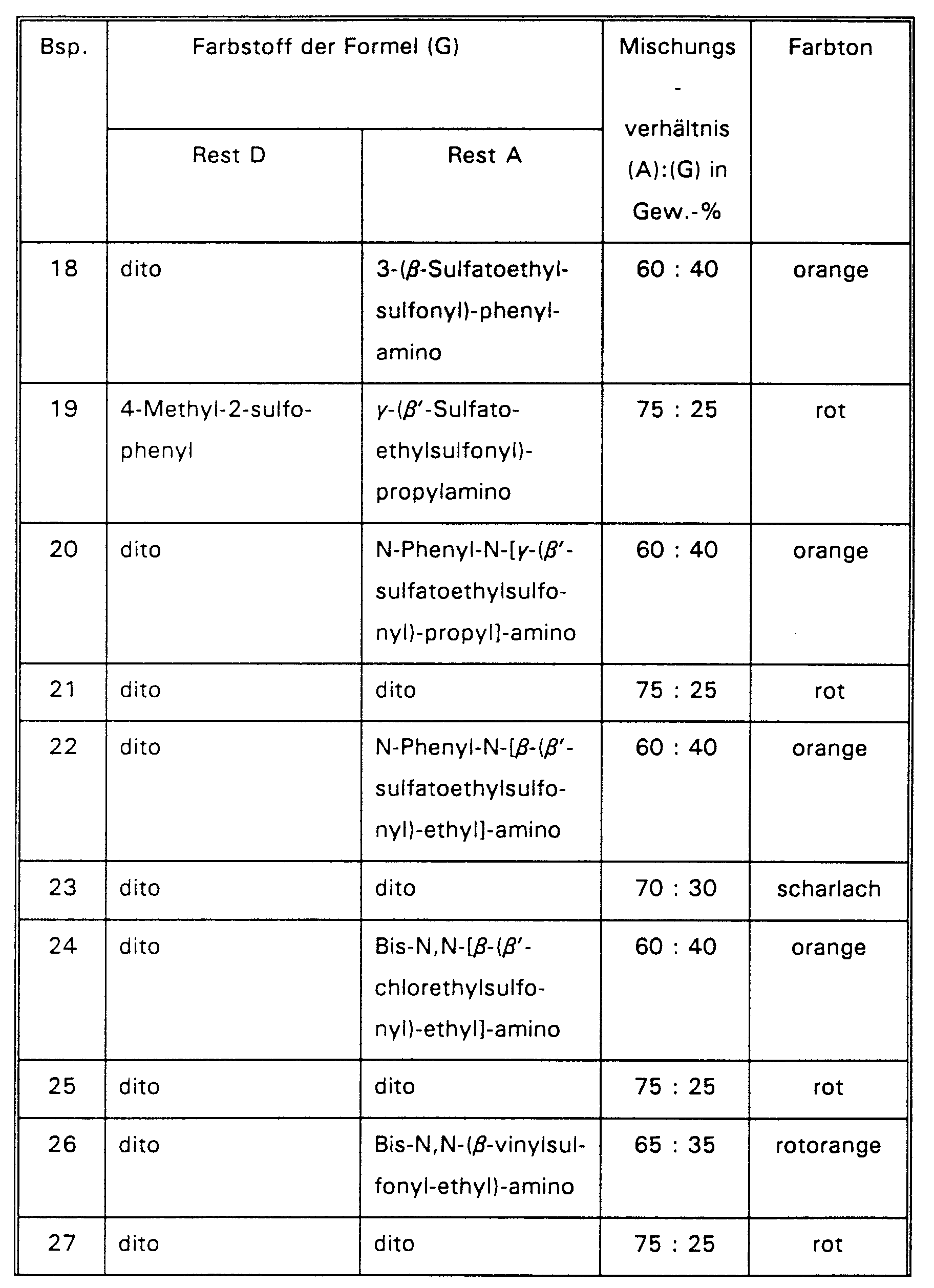 - Dye mixtures of one or more disazo dyes corresponding to the general formula (1) are preferred, in which m and n have the meanings given above, X is chlorine and D 1 and D 2 are the same or different from one another, one of the abovementioned for the formula radical (2a) or (2b) standing radical, and one or more monoazo dyes corresponding to the general formula (2A), in which m and p have the meanings given above, D3 is 3- or 4- ( ⁇ -thiosulfatoethylsulfonyl) phenyl or 3- or 4 - (Vinylsulfonyl) phenyl or 3- or 4- ( ⁇ -sulfatoethylsulfonyl) phenyl, Z is chlorine and R A is chlorine or 4-hydroxy-3-sulfo-phenylamino, in the event that both vinylsulfonyl and There are also ⁇ -sulfatoethylsulfonyl groups in the dye mixtures, and the