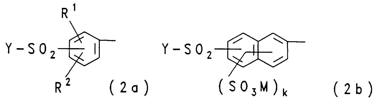 - Residues of the general formulas (2a) and (2b) are, for example, 3- ( ⁇ -sulfatoethylsulfonyl) phenyl, 4- ( ⁇ -sulfatoethylsulfonyl) phenyl, 2-methyl-5-methoxy-4- ( ⁇ -sulfatoethylsulfonyl) phenyl , 2-methoxy-5- ( ⁇ -sulfatoethylsulfonyl) phenyl, 2,5-dimethoxy-4- ( ⁇ -sulfatoethylsulfonyl) phenyl, 1-sulfo-6- ( ⁇ -sulfatoethylsulfonyl) naphth-2-yl, 6 -Sulfo-8- ( ⁇ -sulfatoethylsulfonyl) -naphth-2-yl, 8-sulfo-6- ( ⁇ -sulfatoethy