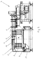 - the device 1 shown in FIGS. 1 and 2 for automatically filling a main magazine 2 of a labeling machine 3 has a carousel-shaped, rotatable magazine carrier 4, on which holding arms 5 are arranged in a circle and at regular intervals from one another.