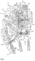 - the device for wire stitching of multi-sheet printed products 10 shown in FIG. 1 and partially in FIG. 2 has a stitching head carrier 12 with double-walled carrier disks 16 seated on a carrier shaft 14 driven in the direction of rotation D. Only one wall of a carrier disk 16 is shown in the figures. Inside the carrier disks 16 there are stitching heads 18 distributed in a star shape, the housings 20 of which are pivotably mounted in the wall of the carrier disks 16 by means of pins 22. The housings 20 are eccentrically penetrated by a hinge axis 24 with respect to the pins 22, the ends of which are guided in endless, self-contained control grooves for determining the pivoting position of the stitching heads 18.