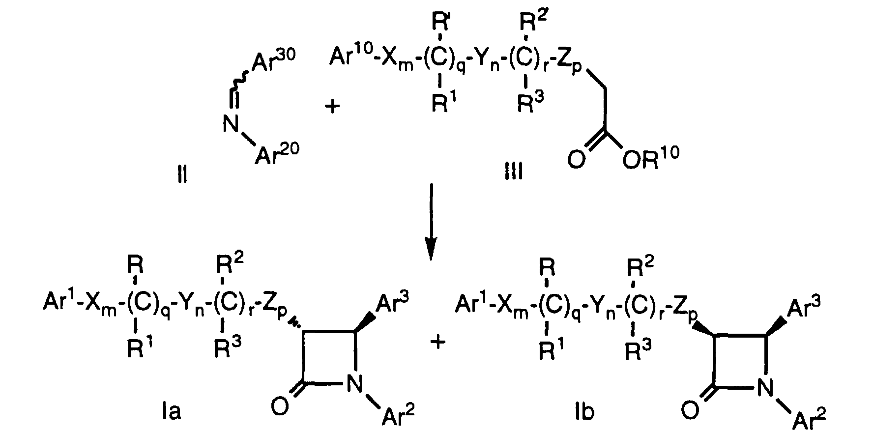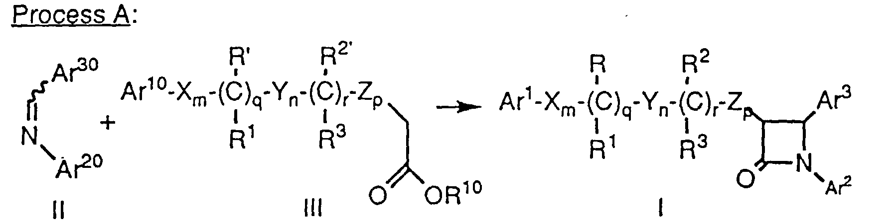 - U.S. 4,983,597 discloses N-sulfonyl-2-azetidinones as anticholesterolemic agents and Ram, et al., in Indian J. Chem., Sect. B. 29B, 12 (1990), p. 1134-7, disclose ethyl 4-(2-oxoazetidin-4-yl)phenoxy-alkanoates as hypolipidemic agents.