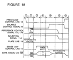 memory cell 101A is selected, a signal voltage from the memory cell appears only on the data signalline 12A. Thus, when the 1T/1C type memory cell is used, it is necessary to generate a reference level used in the sense amplification, on a pairing data line /12A, by means of a special means. For this purpose, the circuit shown in Figure 7 additionally includes referencelevel generating circuits 108A to 108D and control 17A and 17B for thosesignal lines circuits 108A to 108D. A specific method for generating the reference level, is disclosed for example in the above referred 1994 IEEE International Solid-State Circuits Conference (ISSCC), February 18, 1994, Digest of Technical Papers, "Transaction of International Solid-State Circuits Conference (ISSCC)", pages 268-269. The key point of the reference level generation is to generate an intermediate voltage between the data signal line voltage when the signal corresponding to "1" is read out from the memory cell and the data signal line voltage when the signal corresponding to "0" is read out from the memory cell. - Referring to Figure 8, there is illustrated a timing chart of an operation of the