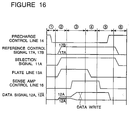 precharge control signal 14 is brought to the low level, so at to cancel the precharge condition of the data signal line. Here, the data signal line precharge level is the ground level. - In the next period (2), the