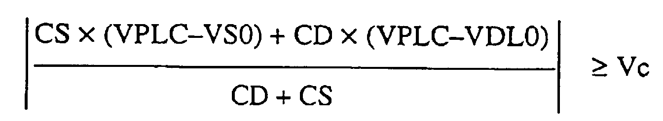- This equation (7) indicates that since the parasitic capacitance CD of the data signal line has a lower limit, unless the parasitic capacitance is not smaller than the lower limit, a voltage not smaller than Vc is not applied between the opposing electrodes of the ferroelectric capacitor. Thus, since the voltage of the data signal line is caused to vary by action of the coupling through the ferroelectric capacitor by dynamically driving the plate line, it is generally said that unless the condition by defined by the equations (4) and (5) is fulfilled, a sufficient read-out voltage cannot be obtained from the memory cell.