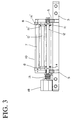 - the upper frame assembly 2 has a drive unit 20 associated therewith, which includes, as illustrated in FIG. 1, a piston-cylinder assembly 116 which engages the front lifting rod 10, thereby pivoting the upper frame assembly 2 about pivot pin 7 in the directions as indicated by arrows 21 and 22. Specifically, when the upper frame assembly 2 pivots upwardly about pivot pin 7 in the direction as indicated by arrow 21, it rises away from the underlying lower frame assembly 1 so that its rollers 11' move away from the rollers 11 of the lower frame assembly 1.