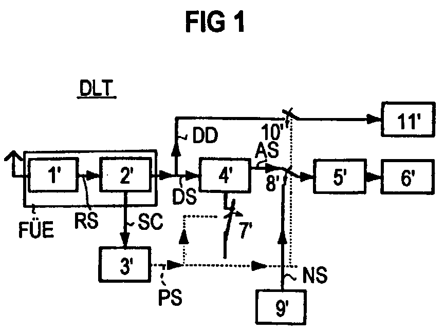 - the receiving device DLT - also a DECT receiving device - has a radio transmission device FÜE for receiving the signals transmitted wirelessly via the radio transmission link.