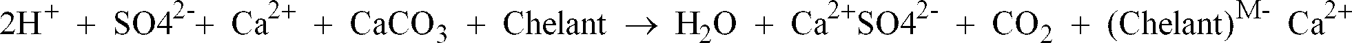 - the CO2 release plus the water formation as indicated in the above reaction contribute to increase the local pH from about 0.5 to about 1 where the chelating agents of the present invention having a pKa not higher than 4 become partially unprotonated and therefore inhibit/reduce calcium sulfate precipitation by binding Ca++ in soluble complexes. Also, they could bind Ca++ ions of the encrustation itself, thus helping its removal.