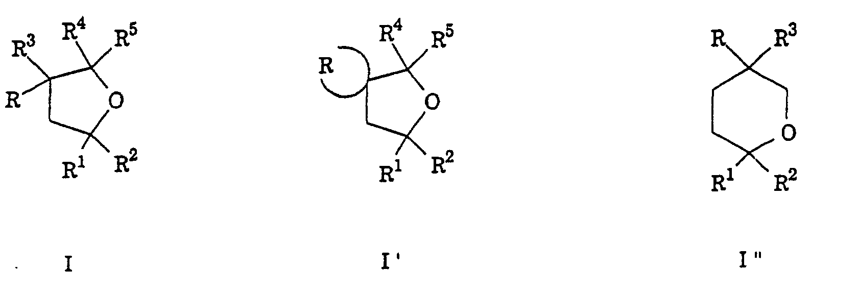 • Tetrahydrofurans of structure I" are representative of spirocycles (R + R 3 in formula I form one of the spirocyclic moieties, which moiety can be monocarbocyclic, with between 5-8 carbon atoms and substituted with at least two methyl groups, or bicyclic where bicyclic refers to two carbon rings, with between 5-8 carbon atoms fused together and the bicyclic system carrying at least two methyl groups.