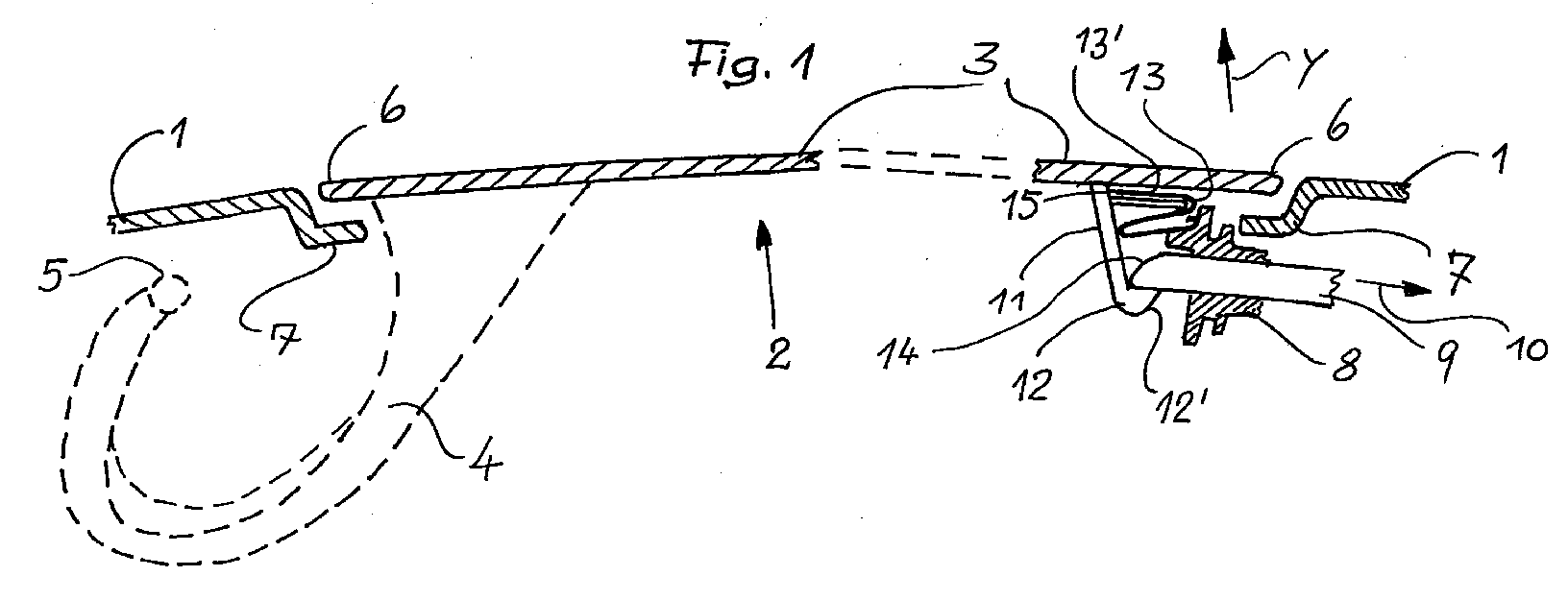 Die Feder 13 wird verständlicherweise beim Zuklappen der Tankklappe 3 gespannt und kann ggfs. auch durch eine andere Feder ersetzt werden. Sie sollte jedoch mit dem oberen Schenkel 13' durch Einführen in eine an der Tankklappe 3 befindliche Tasche 14 gegen Abfallen gesichert sein. Wichtig ist aber in jedem Falle, dass die Feder beim Schliessen der Tankklappe 3 gespannt wird, damit sie später beim Öffnen der Tankklappe 3 die beschriebene Wirkung ( Bildung eines vergrösserten Spaltes ) zustandebringen kann.The