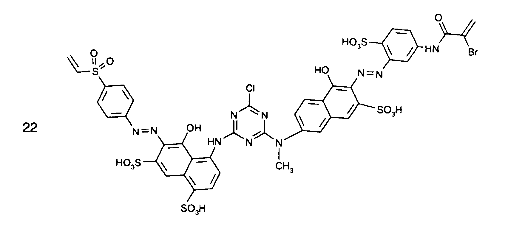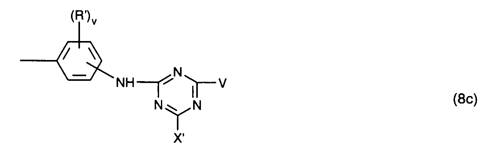 • non-reactive substituents V are amino, methylamino, ethylamino, ⁇ -hydroxyethylamino, N, N-di- ⁇ -hydroxyethylamino, ⁇ -sulfoethylamino, cyclohexylamino, Morpholino, o-, m- or p-chlorophenylamino, o-, m- or p-methylphenylamino, o-, m- or p-methoxyphenylamino, o-, m- or p-sulfophenylamino, disulfophenylamino, o-carboxyphenylamino, 1- or 2-naphthylamino, 1-sulfo-2-naphthylamino, 4,8-disulfo-2-naphthylamino, N-ethyl-N-phenylamino, N-methyl