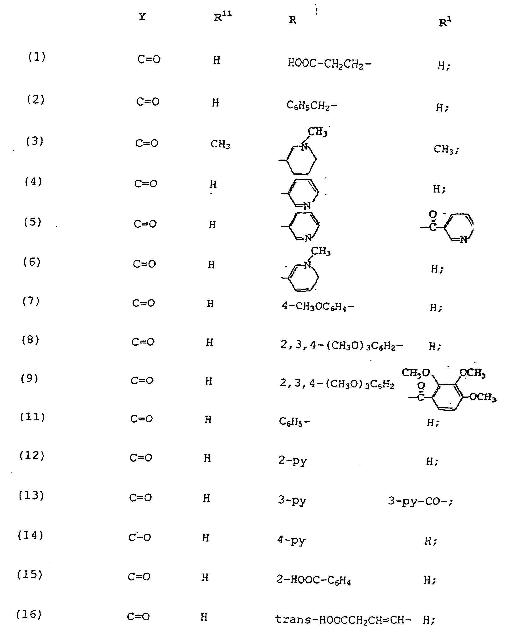 - Huperzin A-Derivat nach Anspruch 1, worin Y C=O ist und R11 H oder C1-5-Alkyl ist; R ist, worin n = 0 oder 1 ist und X Wasserstoff, C1-5-Alkyloxy, Carboxy, Alkyloxycarbonyl, Pyridyl, Dihydro- oder Tetrahydropyridyl ist, das am Stickstoffatom mit C1-5-Alkyl substituiert ist; die Gruppe -(CH2)mCOOZ (worin m = 0-1 ist und Z Wasserstoff oder C1-5-Alkyl ist); oder die Gruppe -CH=CH-G (worin G Phenyl, Furanyl, Carboxy oder Alkyloxycarbonyl ist); und