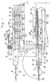 - the elevating means comprises a screw rod disposed at a front plane, where the first entrance is formed in a cutting unit of the die cutter, so as to extend vertically and threadingly engaged with the retaining arm means, a rotary drive mechanism for driving the screw rod, and guide means for guiding the retaining arm means up and down along the screw rod as a result of rotation of the screw rod.